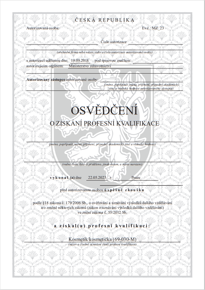 Need dokumendid kinnitavad teie oskusi ja avavad uksi rahvusvahelise taseme tätoveeringumeistri karjääriks. Tšehhi Vabariigi Haridusministeeriumi (Akreditované MŠMT České Republiky) poolt akrediteeritud litsentsi tunnustatakse kõigis Euroopa riikides. See tähendab, et saate laialdased töövõimalused ja võimaluse töötada mis tahes Euroopa Liidu riigis. Soovituskiri, omakorda, suurendab oluliselt teie konkurentsivõimet USA turul, avades juurdepääsu ühele maailma suurimale tätoveeringuturule.