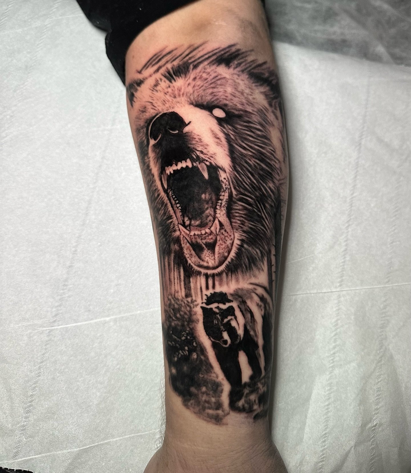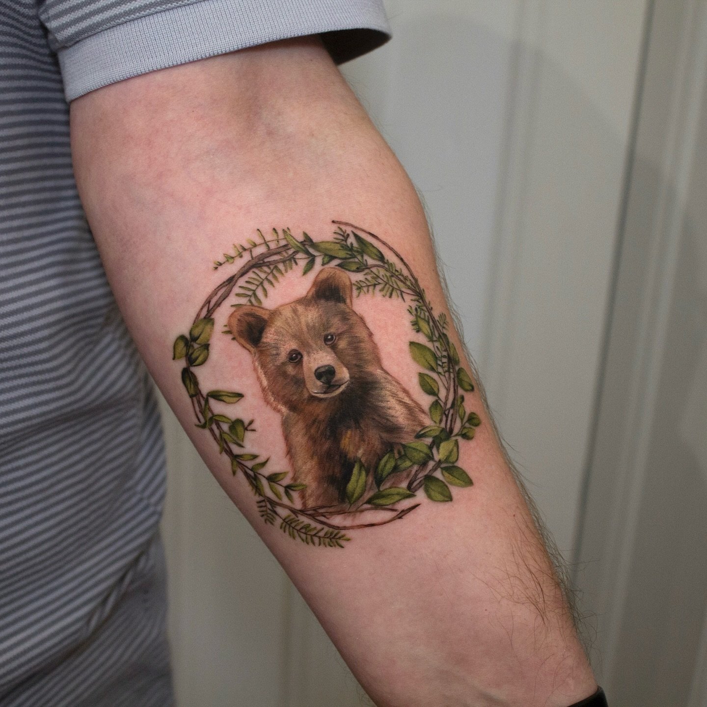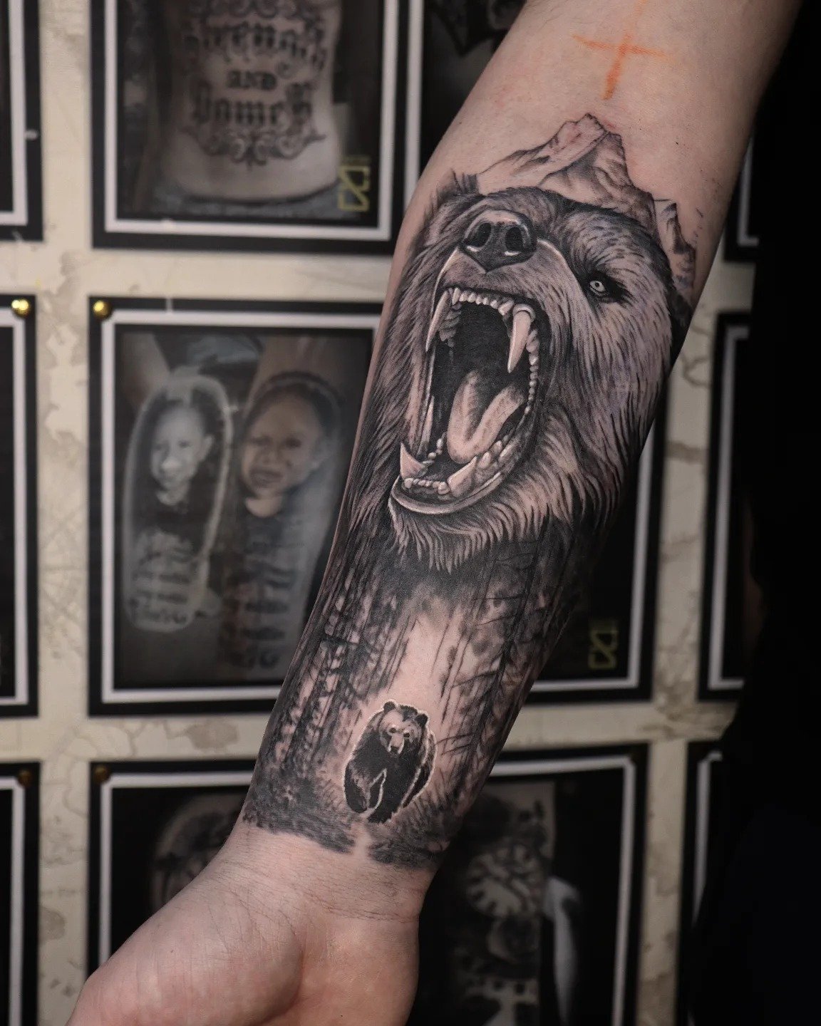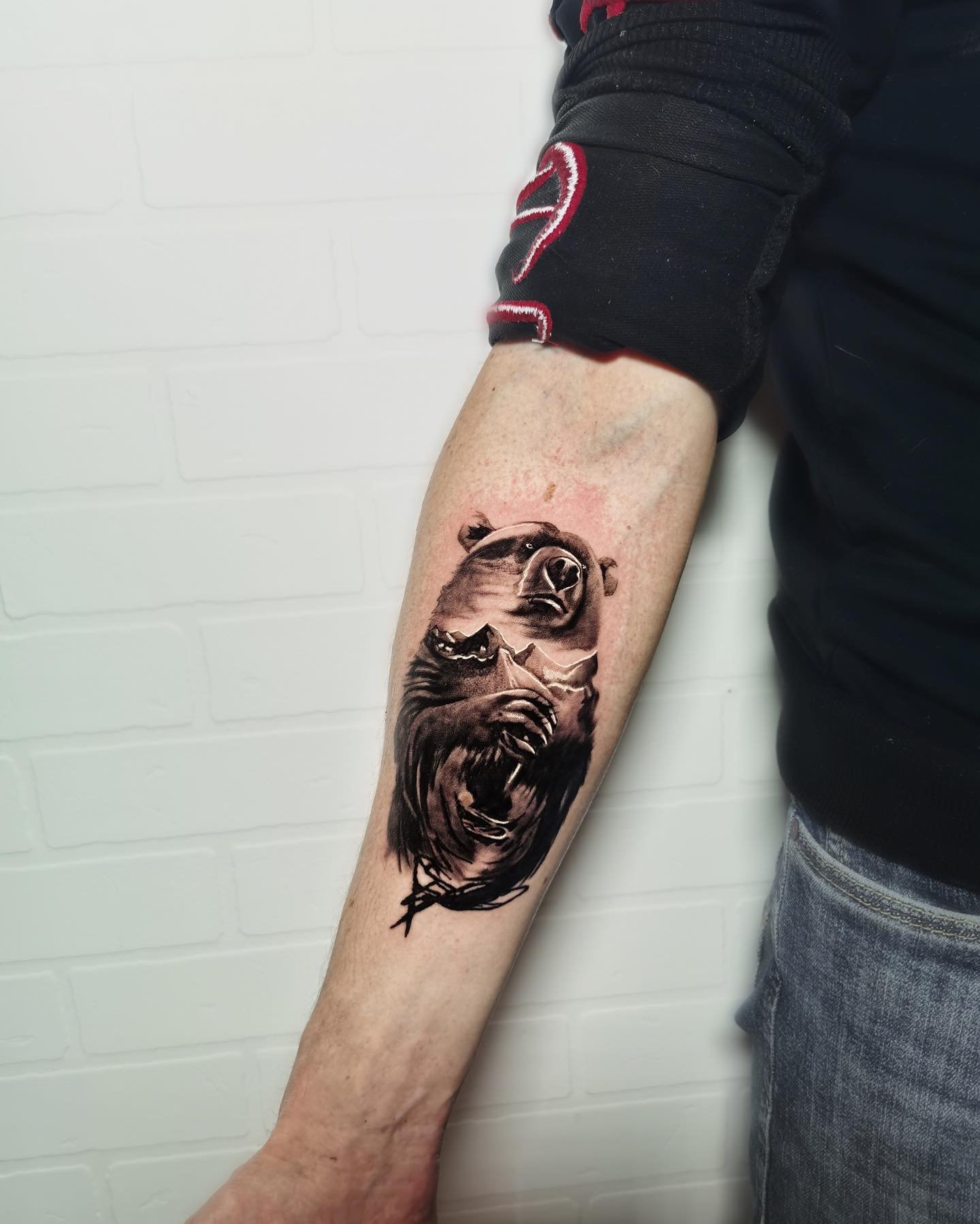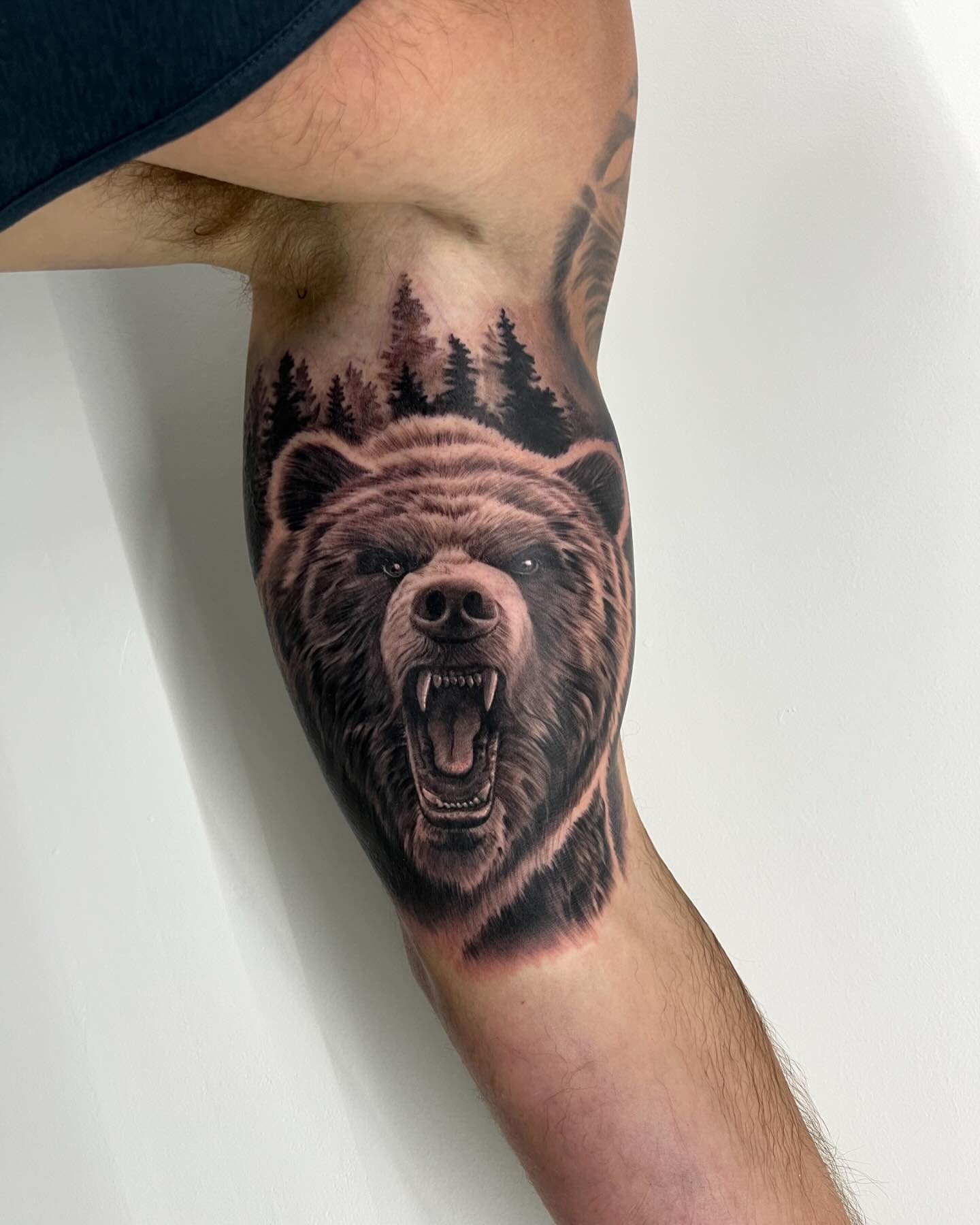 - Realism: A detailed depiction of a bear, where every hair and facial feature is meticulously crafted. Such a tattoo looks incredibly impressive and showcases the artist's skill.