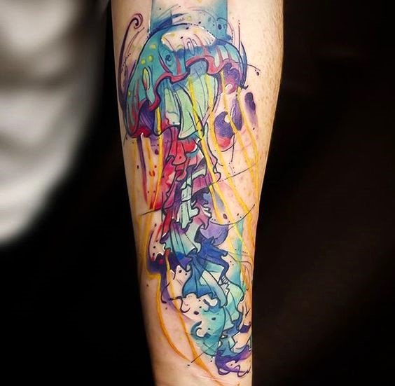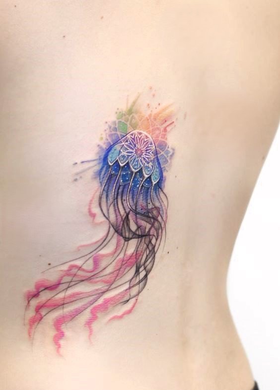 - Акварельные татуировки медуз выглядят невероятно ярко и живо. Этот стиль позволяет передать всю красоту и нежность медузы, используя яркие краски и плавные линии.