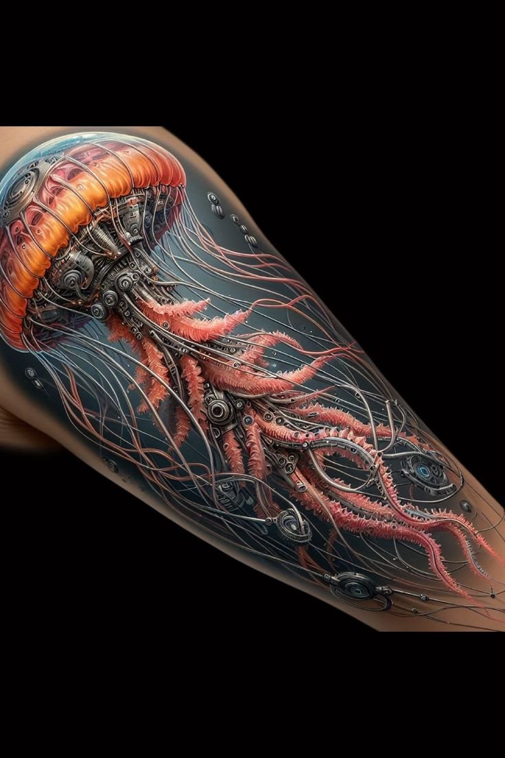 - Такой стиль подчеркивает естественную красоту медузы, с акцентом на прозрачность и легкость её тела. Детализация и цвета делают такие татуировки очень эффектными.