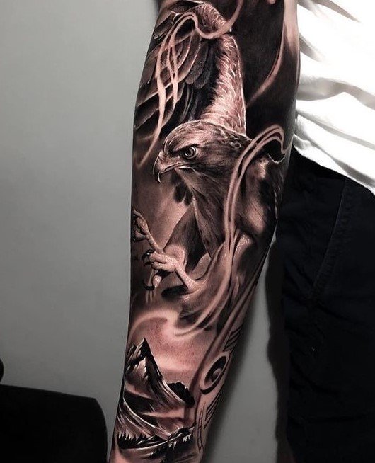 - Vaimsus ja seos kõrgemate jõududega: Paljude rahvaste müütides ja legendides on kotkas vahendaja inimeste ja jumalate maailma vahel. Tema võime hõljuda kõrgel taevas, justkui puudutades päikest, teeb temast vaimse ülenduse ja jumaliku inspiratsiooni sümboli. Kotka tätoveering võib sümboliseerida püüdlust vaimse valgustatuse, seose kõrgemate jõududega ja sisemise harmoonia otsimise poole.