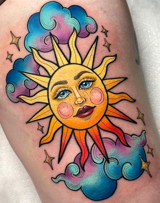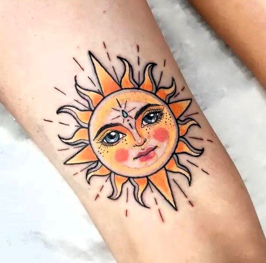 - Traditsiooniline stiil: Iseloomulikud erksad, küllastunud värvid ja selged, paksud kontuurid elustavad traditsioonilises stiilis päikese nahal, andes sellele peaaegu müütilise ilme. Need tätoveeringud on sageli kaunistatud leegitsevate kiirte ja sümboolsete elementidega, nagu päikese keskel olevad näod või silmad, mis kiirgavad valgust ja tarkust.