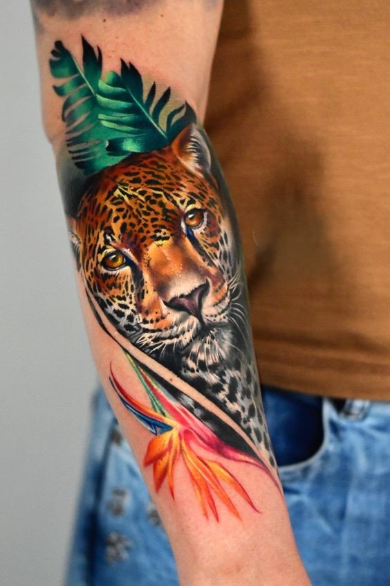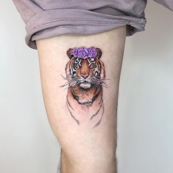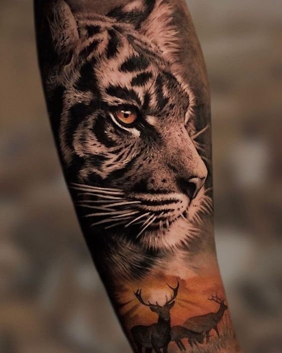 - Reis ja jalg: Pikad ja dünaamilised tiigri kujutised, näiteks hüppav tiiger, näevad suurepärased välja reiel ja jalal. See on ka hea koht suurtele ja detailsetele töödele.
