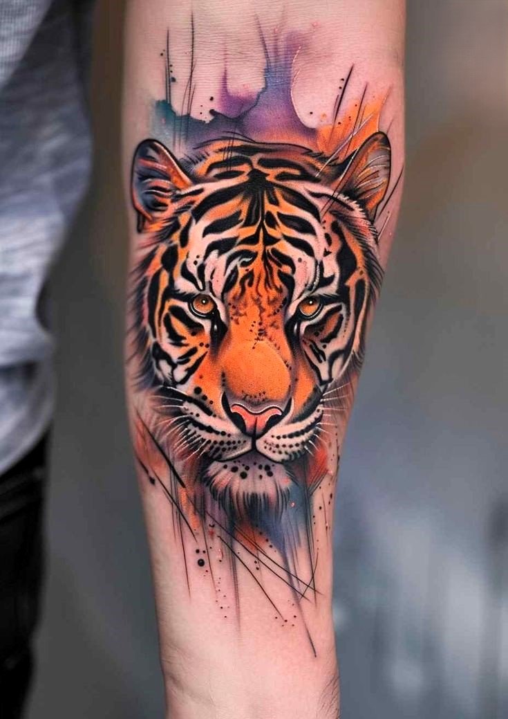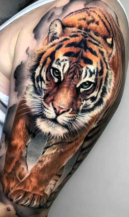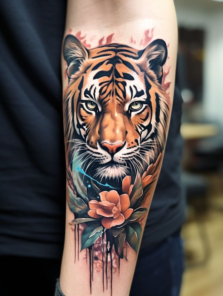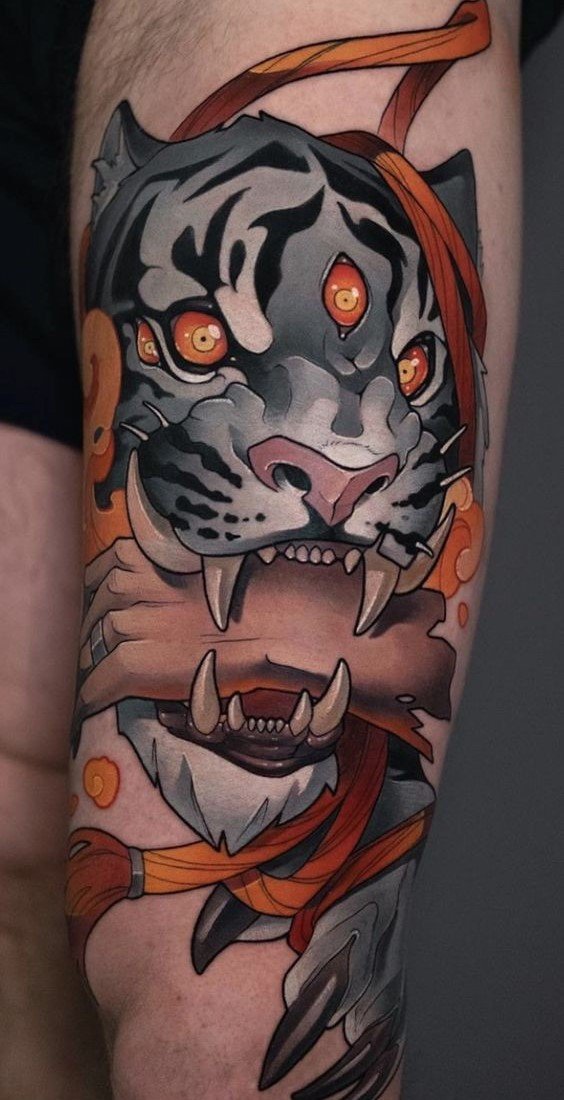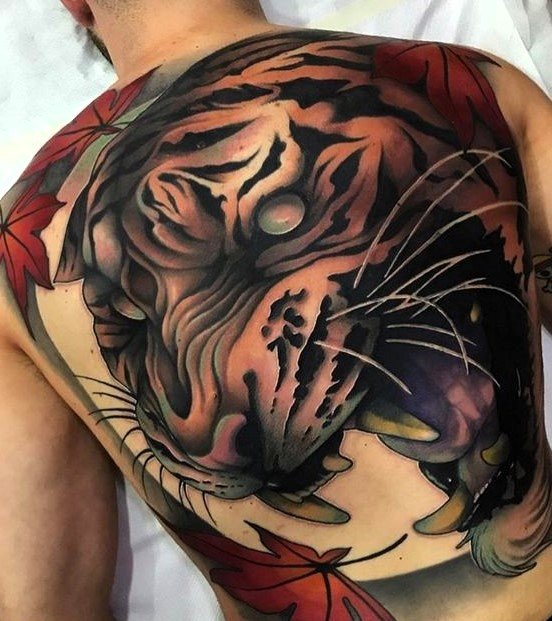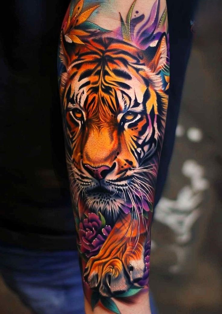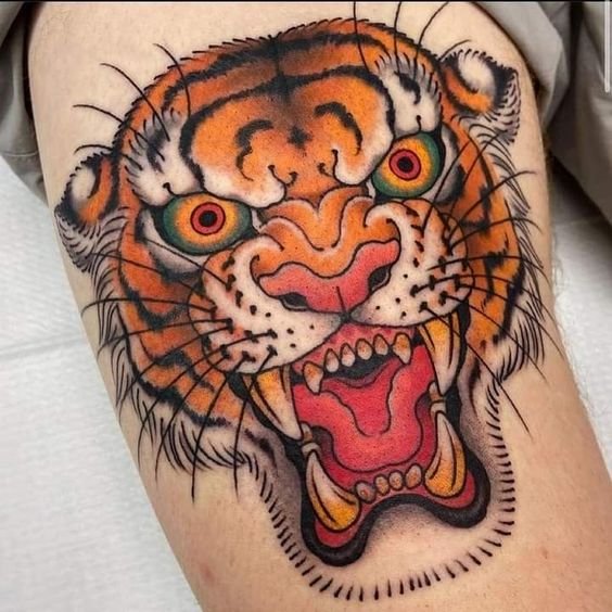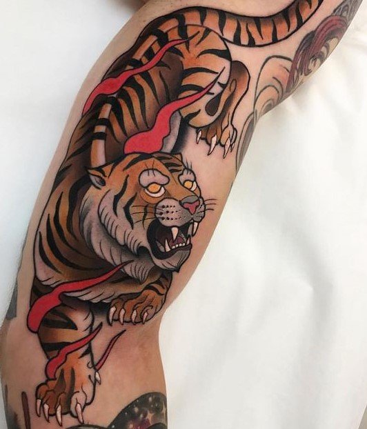 - Traditsiooniline jaapani stiil: Kujutab tiigrit dünaamilistes poosides, ümbritsetuna lainetest, pilvedest või bambusest. Erksad värvid ja julged kontuurid annavad tätoveeringule dramaatilise ilme. Jaapani kultuuris sümboliseerib tiiger kaitset, jõudu ja õnne.